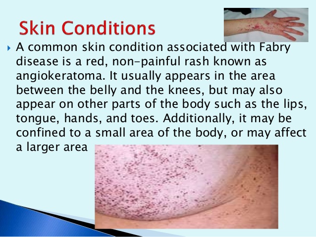 Dark Red Skin Rashes – One of the most visible signs of Fabry disease is a reddish-purplish rash called angiokeratoma. This rash is characteristic of the disease, and may lead doctors to suspect Fabry disease. Angiokeratomas are generally located between the navel and the knees (doctors call this “bathing trunk distribution”), and sometimes in areas where the skin stretches, such as elbows or knees. Angiokeratomas usually appear during adolescence, and can become larger and more numerous with age.