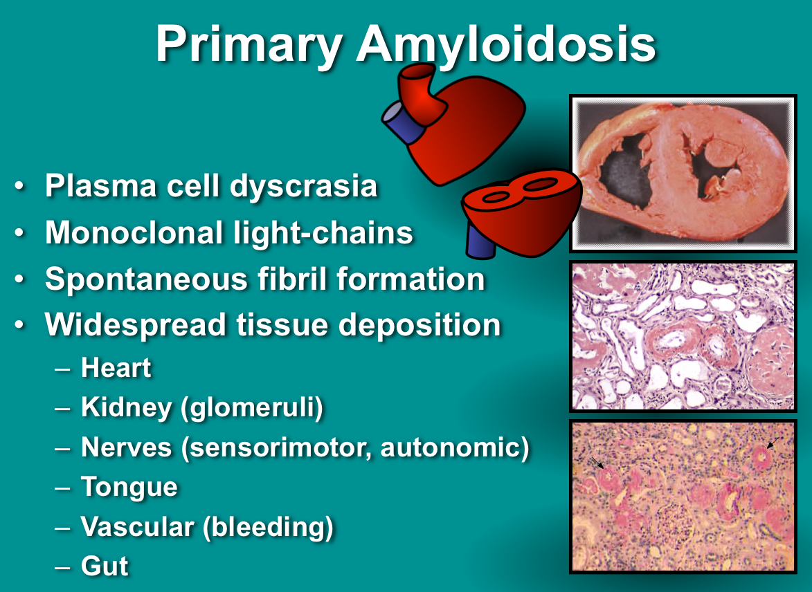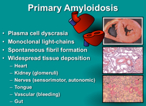 3.) Amyloid if it affects the engine of the human body it will cause reduction of that organ’s function being the heart. It causes your heart’s ability to fill with blood between heartbeats. Less blood is filled up in each chamber of the heart at the normal level an this causes the heart to pump out less cardiac output with each beat, especially the left ventricle of the heart that pumps out oxygenated blood throughout the body. This causes less oxygenated blood to our tissues and like plumbing when the pipes (in this case the arteries with veins) cause back up in the running of blood which go back to the lungs first (does not take long) all the way down to the feet (this takes time). This in the end can make you experience shortness of breath due to fluid build up in the lungs. If amyloidosis affects your heart’s electrical system, your heart rhythm may be disturbed. This can put you into arrhythmias the longer you don’t take care of the situation the worse the rhythm will get.