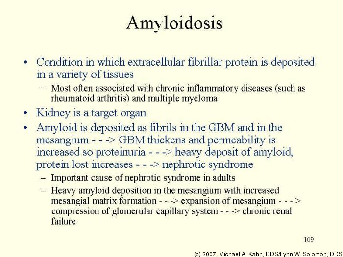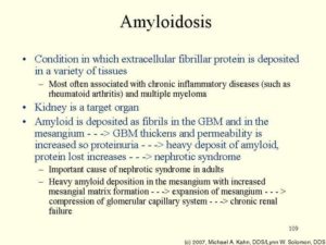 1.) Amyloid can harm the kidneys’ filtering system=our toileting system of the human body which takes toxics out of the bloodstream dumping them into the urinary bladder that our body voids out of the body through urinating. If this organ, the kidneys are affected, this ends up causing protein to leak from your blood into your urine. The kidneys’ ability to remove waste products from your body is lowered, which may eventually lead to kidney failure (if 100% failure occurs now hemodialysis starts causing the amyloidosis to be at risk for just getting worse, see above dialysis-related amyloidosis).