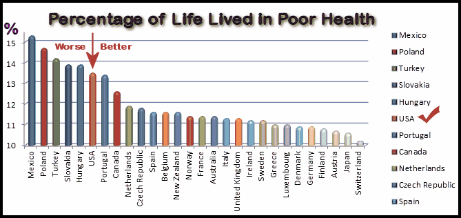 Our country lives in such a poor bill of health where we don’t have to, besides we know better; so sad.  Society is the cause of our health status, choosing poor diet and a bad amount of exercise, if any!  If we don’t care for ourselves we are in store for a disaster of health in America; so sad.