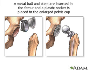 The most common type of hip replacement surgery is called a total hip replacement (THR). In this surgery, worn-out or damaged sections of the hip are replaced with artificial implants. The socket is replaced with durable plastic or polyethylene cup with or without a metal titanium shell. The femoral head is removed and replaced with a ball made from ceramic or a metal alloy. The new ball is attached to a metal stem that is inserted into the top of the femur.