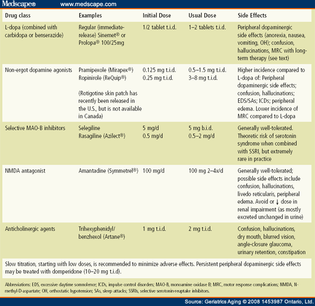 MEDS: The combination of levodopa and carbidopa (Brand names Sinemet, Parcopa, Duopa® (as a combination product containing Carbidopa, Levodopa=Rytary® (as a combination product containing Carbidopa, Levodopa).