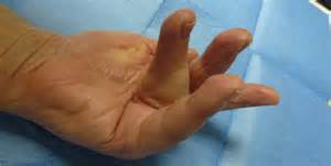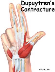 Cords. The nodules may thicken & contract=the formation of dense and tough cords of tissue under the skin. These cords can restrict or tether the fingers and thumb from straightening or from spreading apart.
