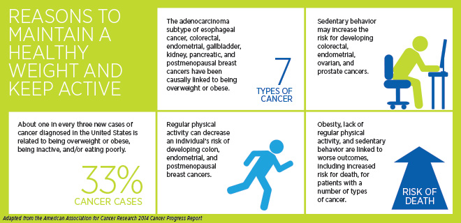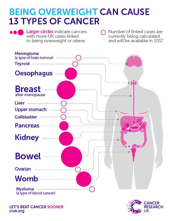 “The link between obesity and cancer risk is clear. Research shows that excess body fat increases your risk for several cancers, including colorectal, post-menopausal breast, uterine, esophageal, kidney and pancreatic cancers.