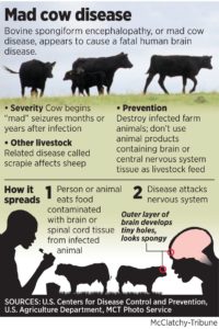 Mad cow disease is a progressive, fatal neurological disorder of cattle resulting from infection by a prion. It appears to be caused by contaminated cattle feed that contains the prion agent. Most mad cow disease has happened in cattle in the United Kingdom (U.K.), a few cases were found in cattle in the U.S. between 2003 and 2006. There were 4 more reported up to 2018. Feed regulations were then tightened.