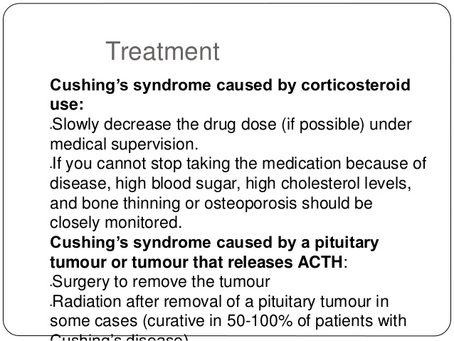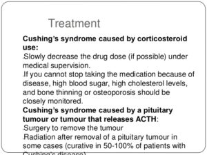 Treatments for Cushing’s syndrome are contrived to pass your body’s cortisol production to normal. By indurate, or even distinctly lowering cortisol levels, you’ll feel evident improvements in your signs and symptoms. Left untreated, however, Cushing’s syndrome can finally induce to death. The treatment choice depend on the cause. For example: