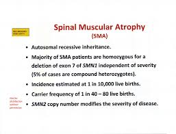 Spinal muscular atrophy is a genetic disorder characterized by weakness and wasting in muscles used for movement (skeletal muscles). It is caused by a loss of specialized nerve cells, called motor neurons that control muscle movement.  In this disease we have an insufficient amount of SMN protein, which leads to permanent loss of motor neurons (Destruction).  The weakness tends to be more severe in the muscles that are close to the center of the body (proximal) compared to muscles away from the body’s center (distal). The muscle weakness usually worsens with age. There are many types of spinal muscular atrophy that are caused by changes in the same genes. The types differ in age of onset and severity of muscle weakness; however, there is overlap between the types. Other forms of spinal muscular atrophy and related motor neuron diseases, such as spinal muscular atrophy with progressive myoclonic epilepsy, spinal muscular atrophy with lower extremity predominance, X-linked infantile spinal muscular atrophy, and spinal muscular atrophy with respiratory distress type 1 are caused by mutations in other genes.