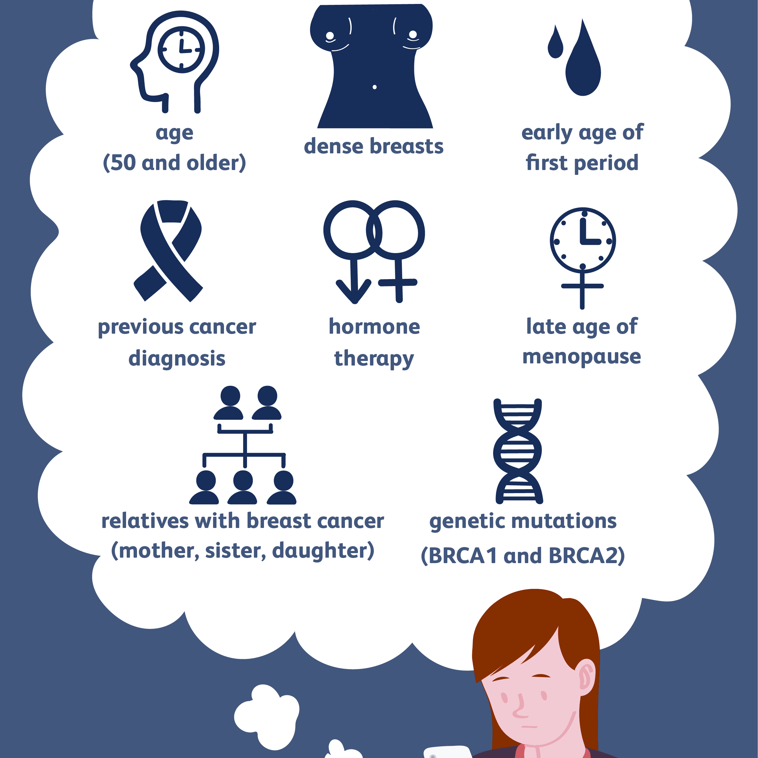 - Control your weight. Being overweight or obese increases the risk of breast cancer. This is especially true if obesity occurs later in life, particularly after menopause.