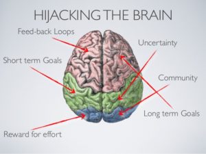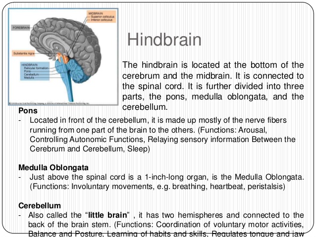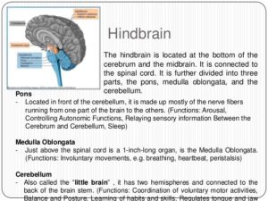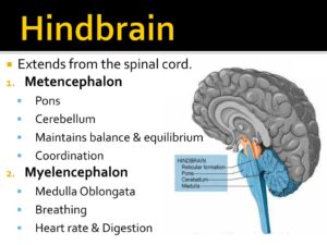 3-The hindbrain includes the upper part of the spinal cord, the brain stem, and a wrinkled ball of tissue called the cerebellum. The hindbrain controls the body’s vital functions such as respiration and heart rate. The cerebellum coordinates movement and is involved in learned rote movements. Rote means “mechanical or habitual repetition of something to be learned.”. Rote learning is flashcards, times tables, any kind of memorization-based learning. Rote movement applies to activities we do in a mechanical, repetitive way. Running, for example.  When you play the piano or hit a tennis ball you are activating the cerebellum= balance/coordination.