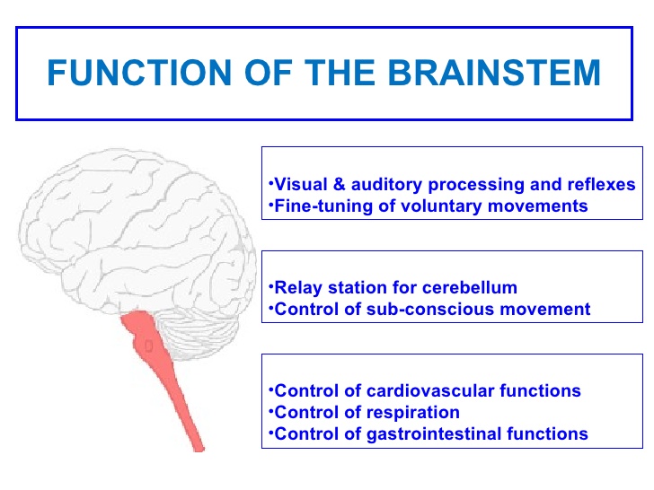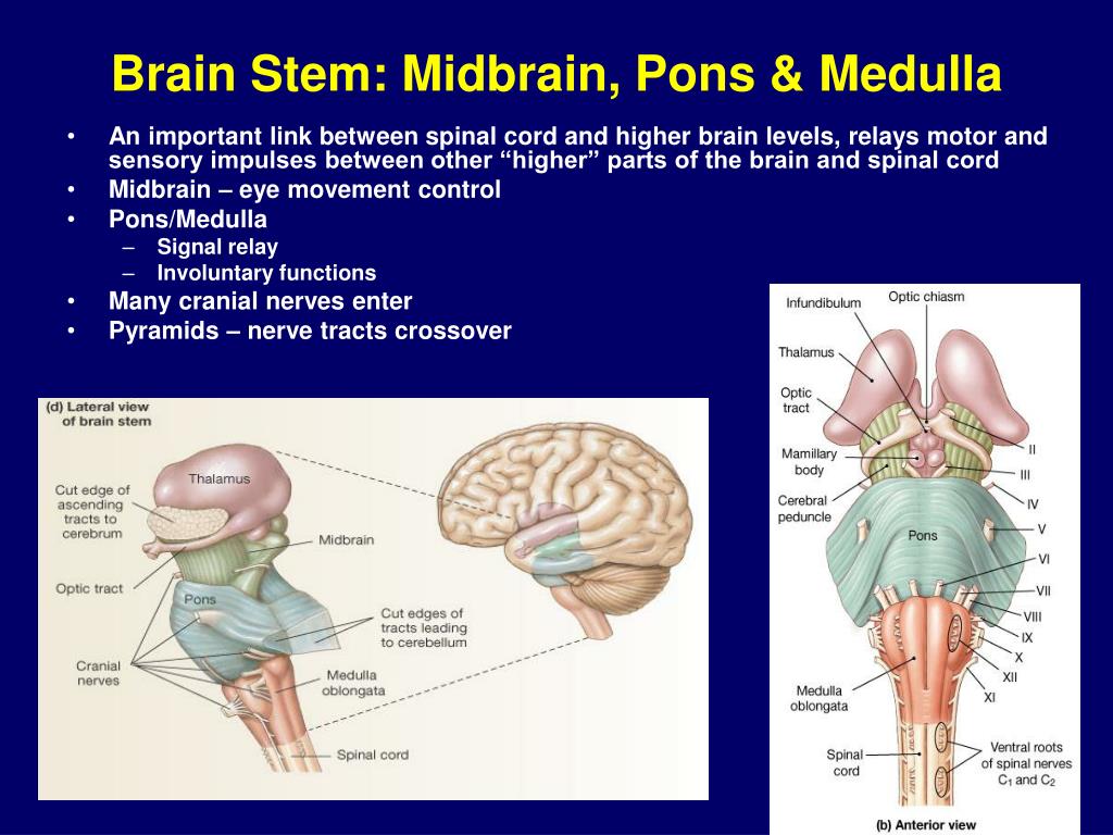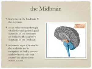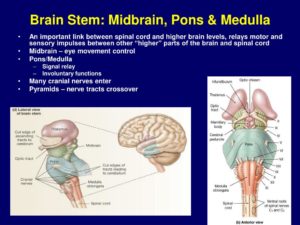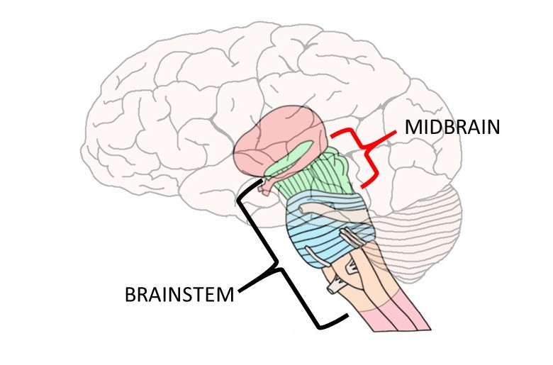 2-Midbrain – The uppermost part of the brainstem is the midbrain, which controls some reflex actions and is part of the circuit involved in the control of eye movements and other voluntary movements.