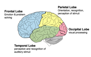 The parietal lobes can be divided into two functional regions. One involves sensation and perception and the other is concerned with integrating sensory input, primarily with the visual system. The first function integrates sensory information to form a single perception (cognition).  The parietal lobes have an important role in integrating our senses. In most people the left side parietal lobe is thought of as dominant because of the way it structures information to allow us to read & write, make calculations, perceive objects normally and produce language. Damage to the dominant parietal lobe can lead to Gerstmann’s syndrome (e.g. can’t tell left from right, can’t point to named fingers), apraxia and sensory impairment (e.g. touch, pain). Damage to the non-dominant lobe, usually the right side of the brain, will result in different problems. This non-dominant lobe receives information from the occipital lobe and helps provide us with a ‘picture’ of the world around us. Damage may result in an inability to recognize faces, surroundings or objects (visual agnosia). So, someone may recognize your voice, but not your appearance (you sound like my daughter, but you’re not her). Damage to the parietal lobe depends on severity and location of the area. Because this lobe also has a role in helping us locate objects in our personal space, any damage can lead to problems in skilled movements (constructional apraxia) leading to difficulties in drawing or picking objects up.
