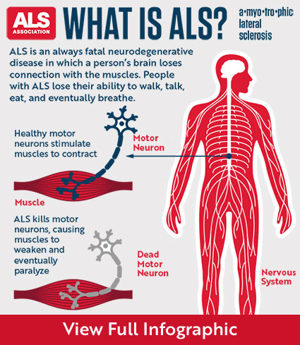 ALS amyotrophic lateral sclerosis is a rare neurological disease affecting nerve cells that control voluntary muscle movement. Amyotrophic Lateral Sclerosis or ALS, more commonly known as Lou Gehrig’s disease, is a terminal and progressive motor neuron disease. ALS specifically targets and kills the motor neurons responsible for controlling the vast majority of skeletal muscles in the human body, which eventually leads to respiratory failure and death.
