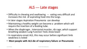 • Far less-common causes of death in ALS include malnutrition as a result of swallowing problems, pulmonary embolism (a blockage in one of the arteries of the lungs), abnormalities in the heart’s electrical pacing system called cardiac arrhythmias, and pneumonia as the result of aspiration (when food or fluid gets into the lungs).