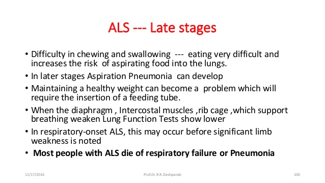 • The vast majority of deaths in ALS are the result of respiratory failure, a process that progresses slowly over months. Medications can relieve discomfort, anxiety, and fear caused by respiratory insufficiency.