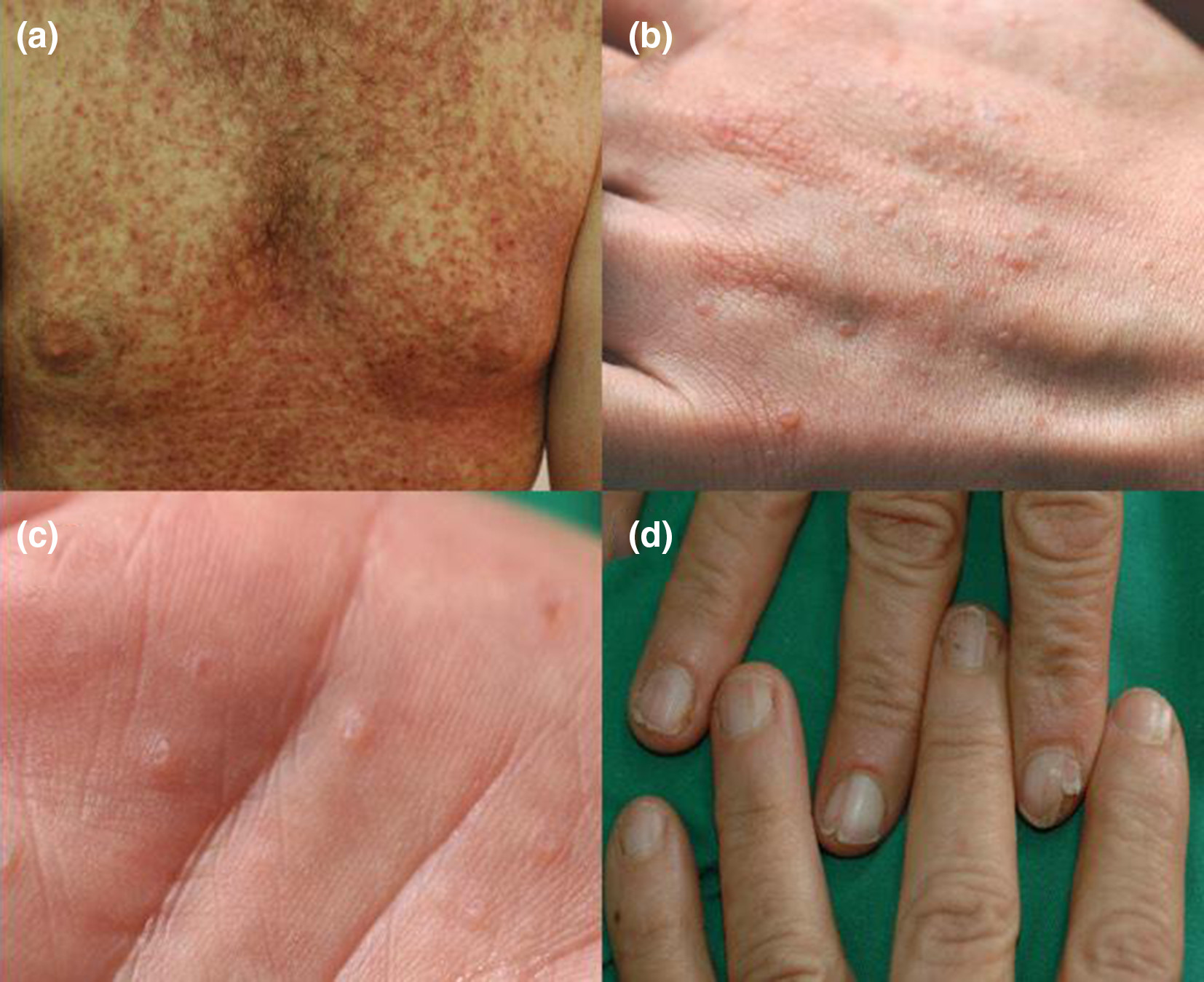 This disease can be characterized by multiple dark scaly patches of itchy skin most commonly affecting the chest, back, ears, forehead, scalp, neck, and groin areas. These wart-like lesions can be foul smelling and disfiguring and has been known to affect nails and mucous membranes of the individual.
