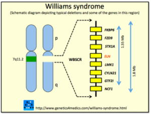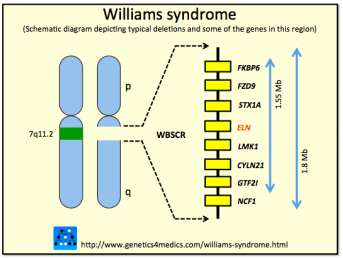 Williams syndrome (WS) is a genetic condition that is present at birth and can affect anyone. It is characterized by medical problems, including cardiovascular disease, developmental delays, and learning disabilities. The most significant medical problem associated with WS is the cardiovascular disease caused by the narrowed arteries. WS is also associated with elevated blood calcium levels in infancy. A random genetic mutation (deletion of a small piece of chromosome 7), rather than inheritance, most often causes the disorder. Williams syndrome is considered an autosomal dominant condition because one copy of the altered chromosome 7 in each cell is sufficient to cause the disorder. In a small percentage of cases, people with Williams syndrome inherit the chromosomal deletion from a parent with the condition.