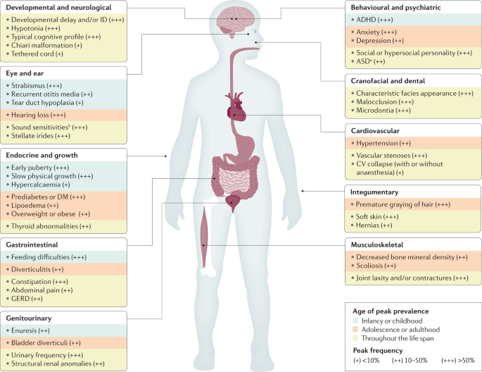 However, individuals who have WS have a 50 percent chance of passing it on if they decide to have children. The characteristic facial features of WS include puffiness around the eyes, a short nose with a broad nasal tip, wide mouth, full cheeks, full lips, and a small chin. People with WS are also likely to have a long neck, sloping shoulders, short stature, limited mobility in their joints, and curvature of the spine. Some individuals with WS have a star-like pattern in the iris of their eyes. Infants with WS are often irritable and colicky, with feeding problems that keep them from gaining weight. Chronic abdominal pain is common in adolescents and adults. By age 30, the majority of individuals with WS have diabetes or pre-diabetes and mild to moderate sensorineural hearing loss (a form of deafness due to disturbed function of the auditory nerve). For some people, hearing loss may begin as early as late childhood. WS also is associated with a characteristic “cognitive profile” of mental strengths and weaknesses composed of strengths in verbal short-term memory and language, combined with severe weakness in visuospatial construction (the skills used to copy patterns, draw, or write). Most older children and adults with WS speak fluently and use good grammar. More than 50% of children with WS have attention deficit disorders (ADD or ADHD), and about 50% have specific phobias, such as a fear of loud noises. The majority of individuals with WS worry excessively.