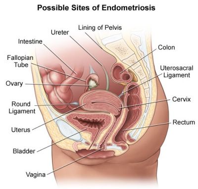 Endometriosis is a painful, chronic disease that affects at least 6.3 million women and girls in the U.S., 1 million in Canada, and millions more worldwide. It occurs when tissue like that which lines the uterus (tissue called the endometrium) is found outside the uterus — usually in the abdomen on the ovaries, fallopian tubes, and ligaments that support the uterus; the area between the vagina and rectum; the outer surface of the uterus; and the lining of the pelvic cavity. Other sites for these endometrial growths may include the bladder, bowel, vagina, cervix, vulva, and in abdominal surgical scars. Less commonly they are found in the lung, arm, thigh, and other locations.