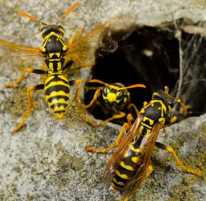 Yellow jackets, which have black and yellow stripes on the abdomen, form underground nests.