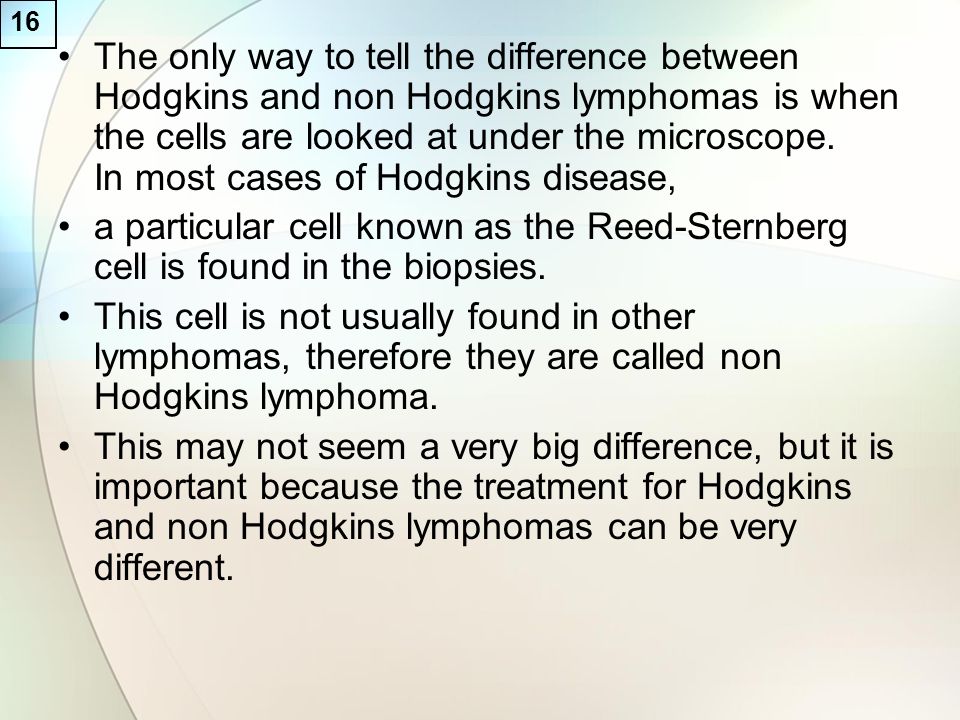 A particular cell known as the Reed-Sternberg cell is found in the biopsies. This cell is not usually found in other lymphomas, therefore they are called non Hodgkins lymphoma. This may not seem a very big difference, but it is important because the treatment for Hodgkins and non Hodgkins lymphomas can be very different.