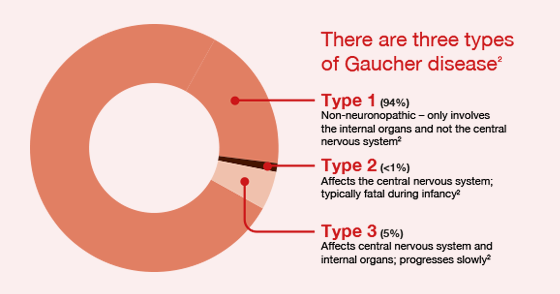 There are different types of Gaucher disease, and signs and symptoms of disease vary widely, even within the same type. Type 1 is by far the most common.