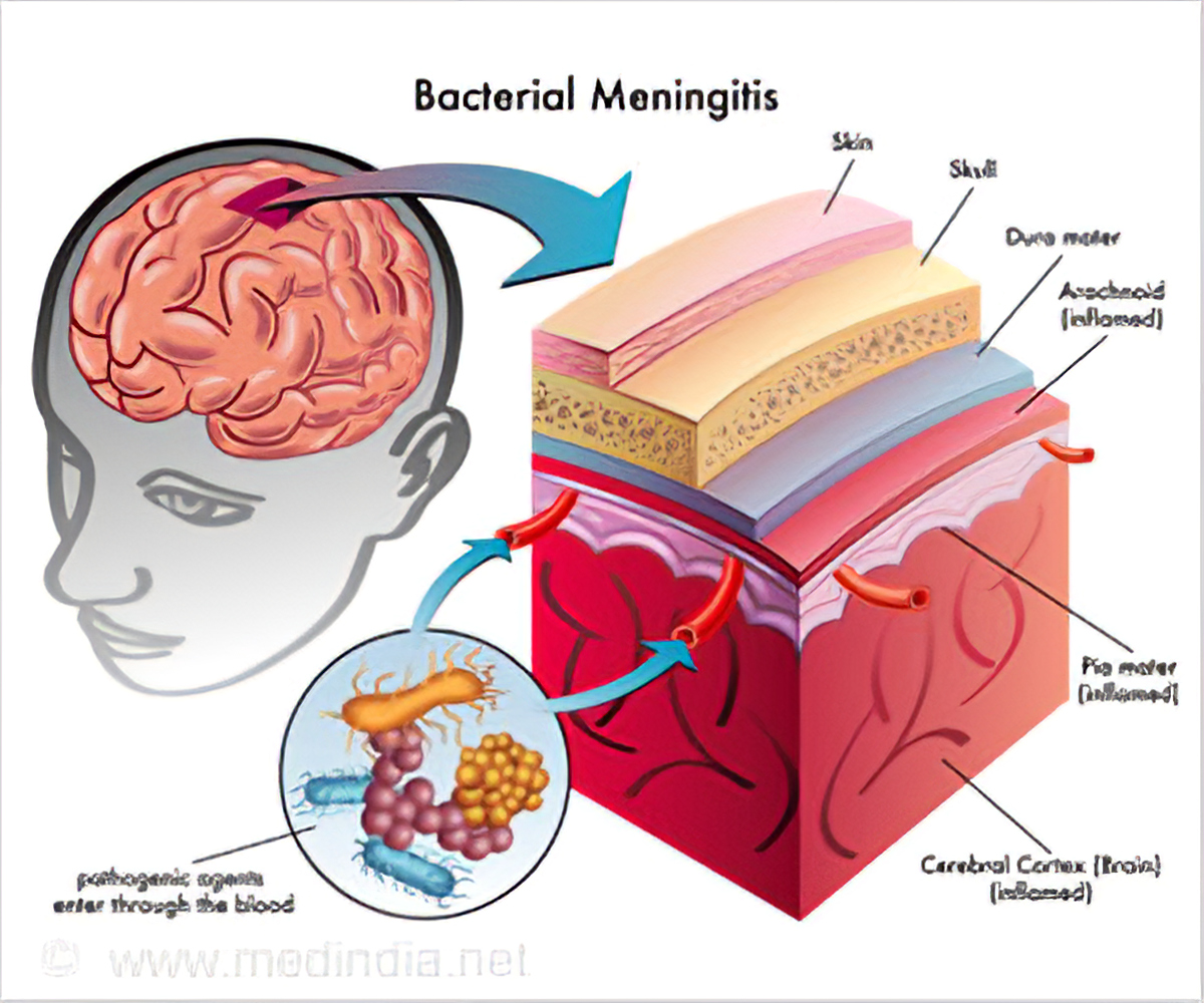 Meningococcal meningitis evolves when the bacteria, Neisseria meningitidis (N.meningitidis) progresses from initial adherence to the nasopharyngeal (nose and throat) mucosa to invasion of the deeper mucosal layers (the submucosa). These bacteria rapidly multiply, and can lead to a mild (subclinical) infection. However, in approximately 10-20% of cases, the N.meningitidis enters the bloodstream (meningococcemia). This systemic form of the disease, meningococcemia, usually precedes the development of meningococcal meningitis by 24-48 hours.