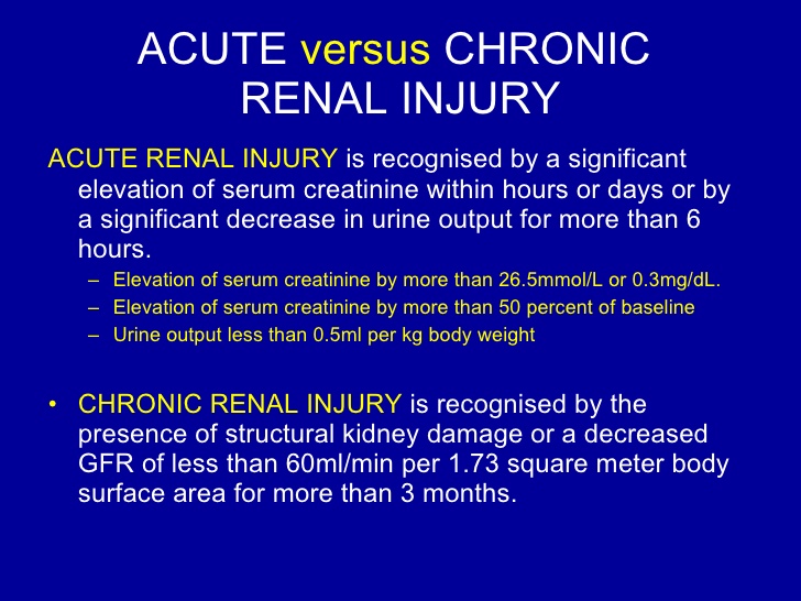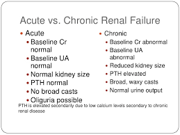 Chronic kidney disease is also called chronic renal failure or chronic renal insufficiency.There are five stages of kidney disease, from kidney damage with normal GFR to kidney failure. So GFR will help the MD rule out acute versus chronic to give the MD direction on Rx.Your doctor will ask questions about any past kidney problems. He or she will also ask whether you have a family history of kidney disease and what medicines you take, both prescription and over-the-counter drugs.